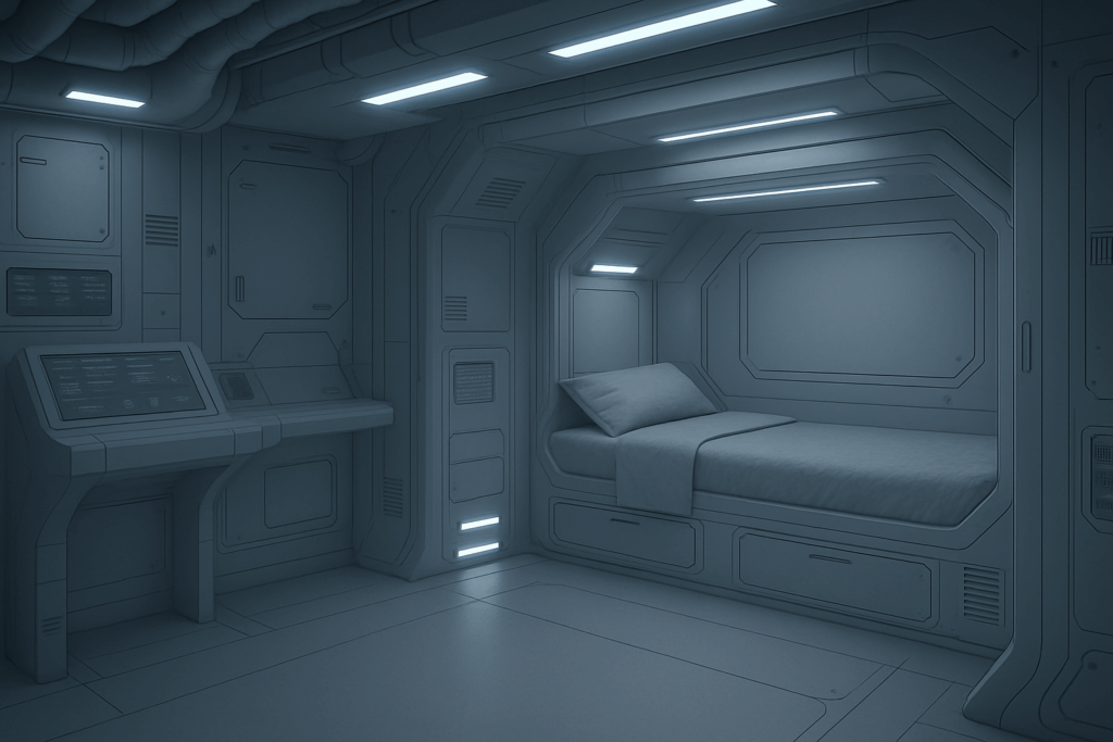 The scene suddenly feels cold, isolated, and clinical. Despite being a crew quarters area, a place that should feel restful, the lighting introduces unease. It suggests sterility, perhaps even emotional distance or tension. You might imagine a spaceship mid-mission, where sleep is monitored by AI and comfort is secondary to control.