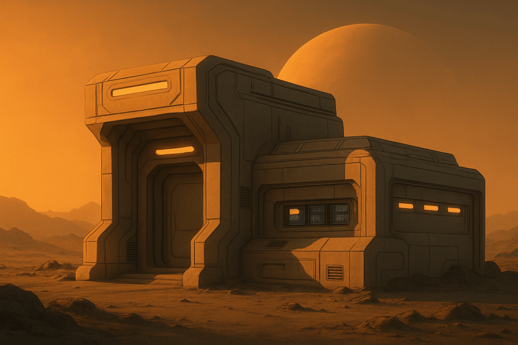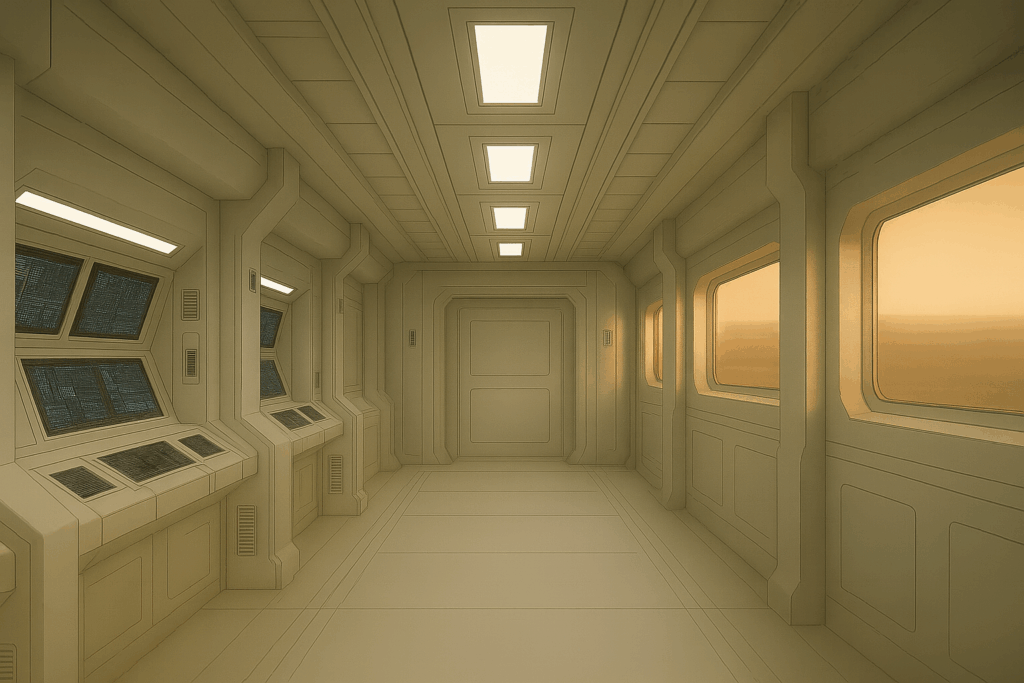 The scene feels nostalgic, peaceful, and human. It could represent a base at the end of a long day, or a structure abandoned but still warmed by the memory of life. Warm lighting like this brings a touch of emotion to cold sci-fi worlds, perfect for endings, reflections, or moments of calm before chaos.